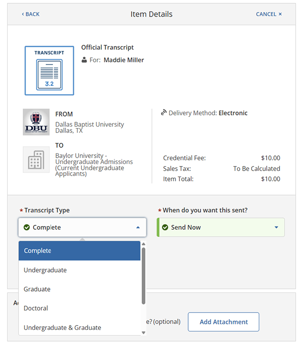 You will be taken to the following page. Your Transcript Type indicates the type of degree you pursued at Dallas Baptist University. If you attended DBU for multiple academic levels, you may choose to have your complete academic history sent with the “Complete” option. This is the default selection. If you wish to have any academic level(s) omitted, you may instead choose the specific ones you want to be included in your transcript.