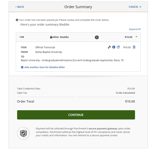 After you select “Submit Payment,” your order will be placed. You should receive a confirmation email shortly after from Parchment.
